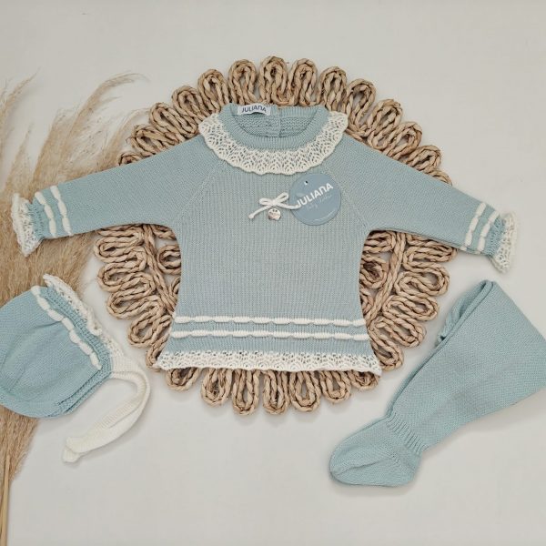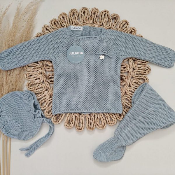 ¡Síguenos en Instagram! CONJUNTO 3P RECOGIDAS JULIANA AZUL MARCA COMPOSICIÓN Punto: 100% Acrílico OBSERVACIÓN El tallaje de Juliana no es